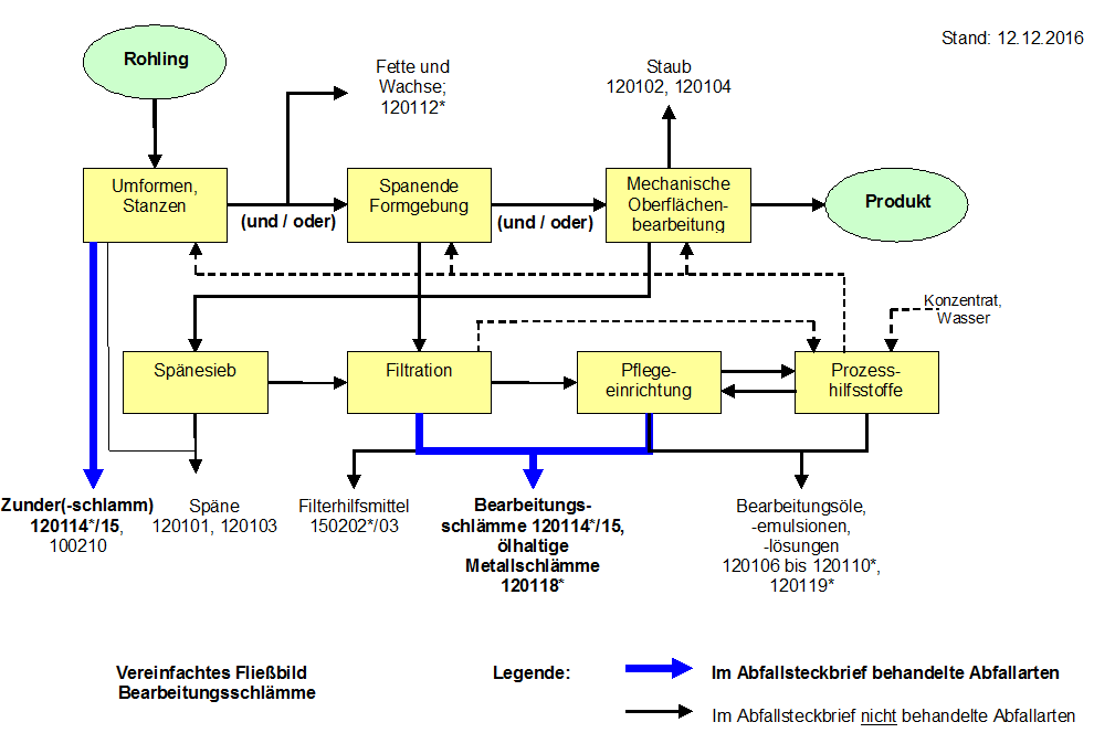 Die Ausführungen beschränken sich auf Schlämme, welche bei der mechanischen Oberflächenbearbeitung von Metallen anfallen können. Es handelt sich insbesondere um Abfälle, die im Rahmen von schleifenden bzw. spanenden Bearbeitungstechniken aufkommen. In dem nachfolgenden Schema sind auch die Abfälle angegeben, die neben den Schlämmen (AS 120114*, 120115 und 120118*) bei dem Prozess zur Formgebung und der Oberflächenbehandlung unter Verwendung von Prozesshilfsmitteln anfallen.