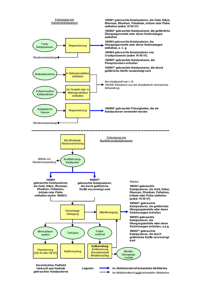 (*) Begriffsbestimmung aus der Abfallverzeichnis-Verordnung zu AS 160802*/AS 160803: Übergangsmetalle im Sinne dieses Vorschrift sind Scandium, Vanadium, Mangan, Cobalt, Kupfer, Yttrium, Niob, Hafnium, Wolfram, Titan, Chrom, Eisen, Nickel, Zink, Zirconium, Molybdän und Tantal. Wenn diese Metalle oder ihre Verbindungen als gefährliche Stoffe eingestuft wurden, werden Katalysatoren mit diesen Stoffen als gefährliche Abfälle behandelt.