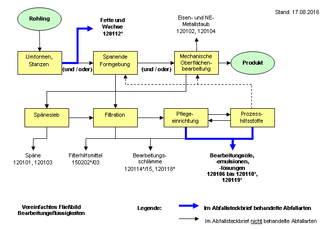 Die Ausführungen beschränken sich auf Bearbeitungsöle, -emulsionen und -lösungen sowie Fette und Wachse aus der Metallbearbeitung. Insgesamt geht es um Abfälle, die aus spangebenden und spanlosen Bearbeitungsverfahren resultieren. Die Verfahren können in umformend (z. B. Biegen) oder spanend (z. B. Fräsen oder Schleifen) eingeteilt werden. Zu den oben genannten Abfallschlüsseln bestehen keine Spiegeleinträge, wodurch alle aufgeführten Abfälle als generell gefährlich eingestuft werden.