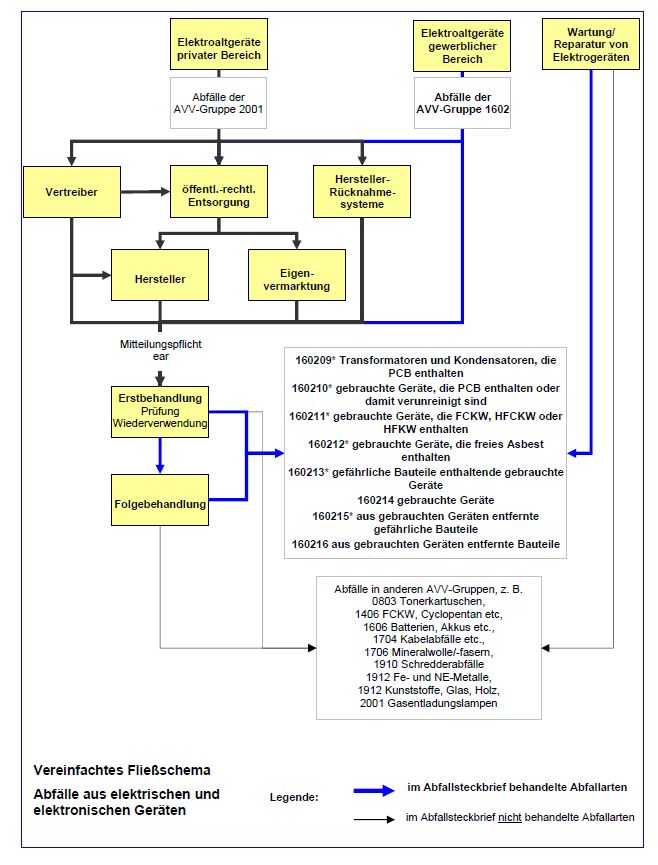 Der weit überwiegende Teil der gesammelten Elektro- und Elektronikaltgeräte (EAG) fällt zunächst unter die Abfallverzeichnis-Verordnung(AVV)-Gruppe 20 01 „Siedlungsabfälle (Haushaltsabfälle und ähnliche gewerbliche und industrielle Abfälle sowie Abfälle aus Einrichtungen), einschließlich getrennt gesammelter Fraktionen; Getrennt gesammelte Fraktionen (außer 15 01)“ und wird erst nach der Erstbehandlung der AVV Gruppe 16 02 zugeordnet. Diese umfasst EAG aus Sammlungen und Einzelanlieferungen sowie Bau- und Bestandteile von EAG, die bei der Demontage und der Schadstoffentfrachtung anfallen. Im gewerblichen Bereich anfallende Monochargen wie z. B. Transformatoren können direkt dem Unterkapitel 16 02 zugeordnet sein.