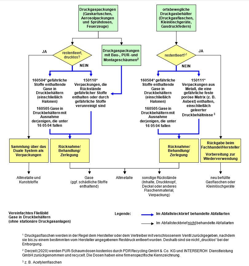 Hierzu zählen insgesamt z. B. Druckgaspackungen wie Sprüh-, Spray- und Aerosoldosen oder Druckgaskartuschen und Druckgasflaschen. Ortsfeste Druckbehälter sind nicht berücksichtigt. Unter dem Abfallschlüssel 150111* werden Acetylengasflaschen eingestuft. Polyurethan (PUR) -Schaumdosen und andere Sprühdosen fallen unter dem Abfallschlüssel 150110*.