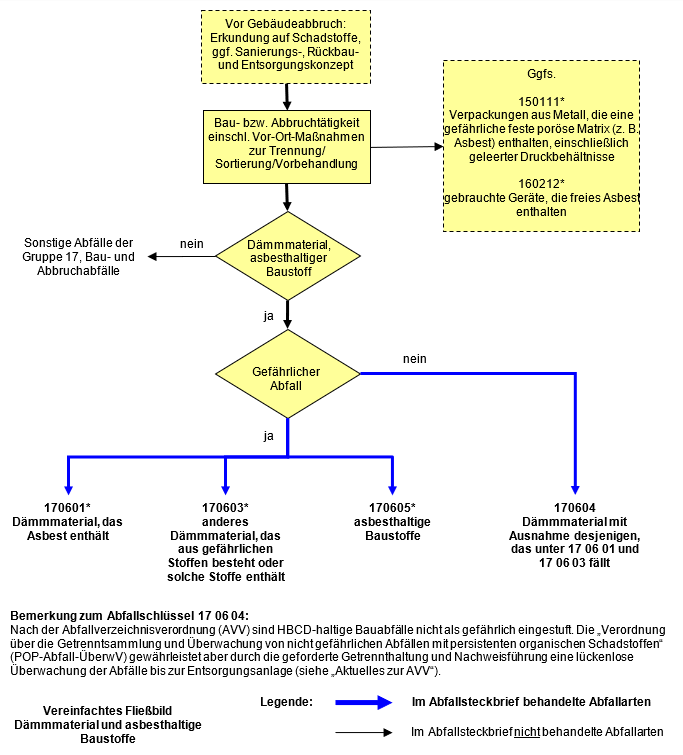 Die Ausführungen beschränken sich auf die bei Bautätigkeiten (z. B. Neubau, Abbruch, Sanierung) anfallenden gefährlichen und nicht gefährlichen Dämmmaterialien der Abfallart 170601*, 170603* und 170604 sowie asbesthaltige Baustoffe der Abfallart 170605*.