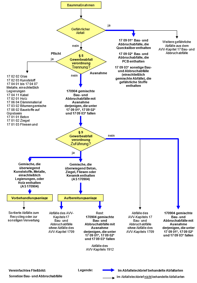 In diesem Abfallsteckbrief werden die bei Bautätigkeiten (z. B. Neubau, Abbruch, Sanierung) anfallenden quecksilber- und PCB-haltigen Abfälle sowie gemischte Bau- und Abbruchabfälle mit signifikanten nichtmineralischen Bestandteilen beschrieben. Letztere werden umgangssprachlich auch Baustellenabfälle bzw. Baumischabfälle genannt und sollen gemäß der Gewerbeabfallverordnung (GewAbfV) nur noch in Ausnahmefällen anfallen. Es ist zu prüfen, ob diese Abfälle einem anderen, spezifischeren Abfallschlüssel des Kapitels 17 zugeordnet werden können, sofern Art und Menge der Nebenbestandteile bzw. Schadstoffe dies erlauben.