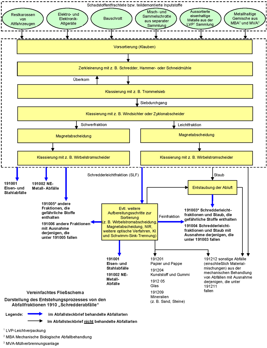 Vereinfachtes Fließschema für 1910 Abfälle aus dem Schreddern von metallhaltigen Abfällen (Quelle: Landesamt für Umwelt Rheinland-Pfalz, GNS)